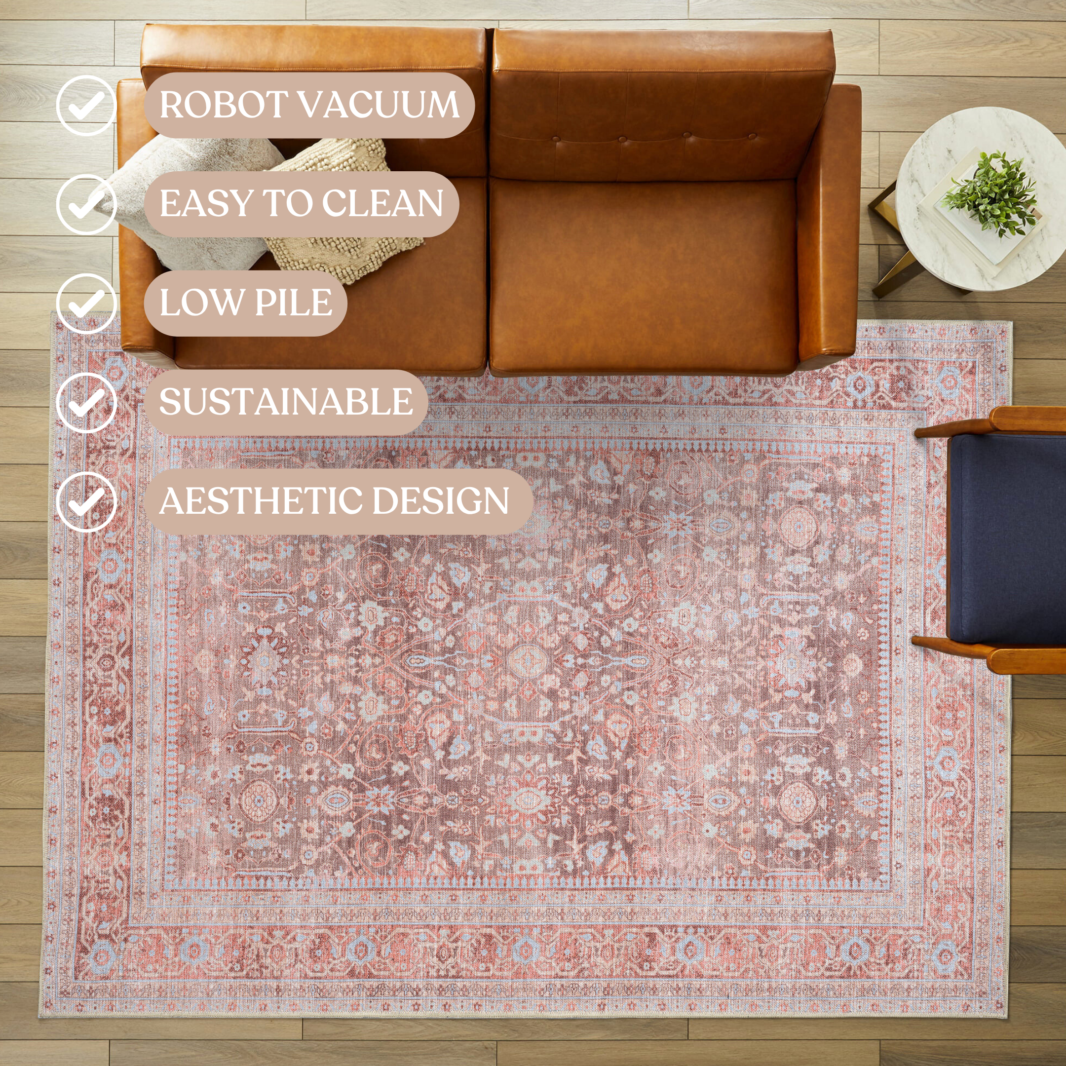 - Easy MaintenanceΒ β low-pile, flatweave, and washable options make cleaning simple.
