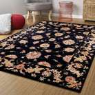Kita offers hand-knotted floral Azerbaijani black rugs with Turkish vintage style, featuring a floral design drawn in beige and orange, to add bohemian farmhouse style and comfort underfoot. Perfect for all areas of the home. This rug can fit wonderfully in any room you want to make special.