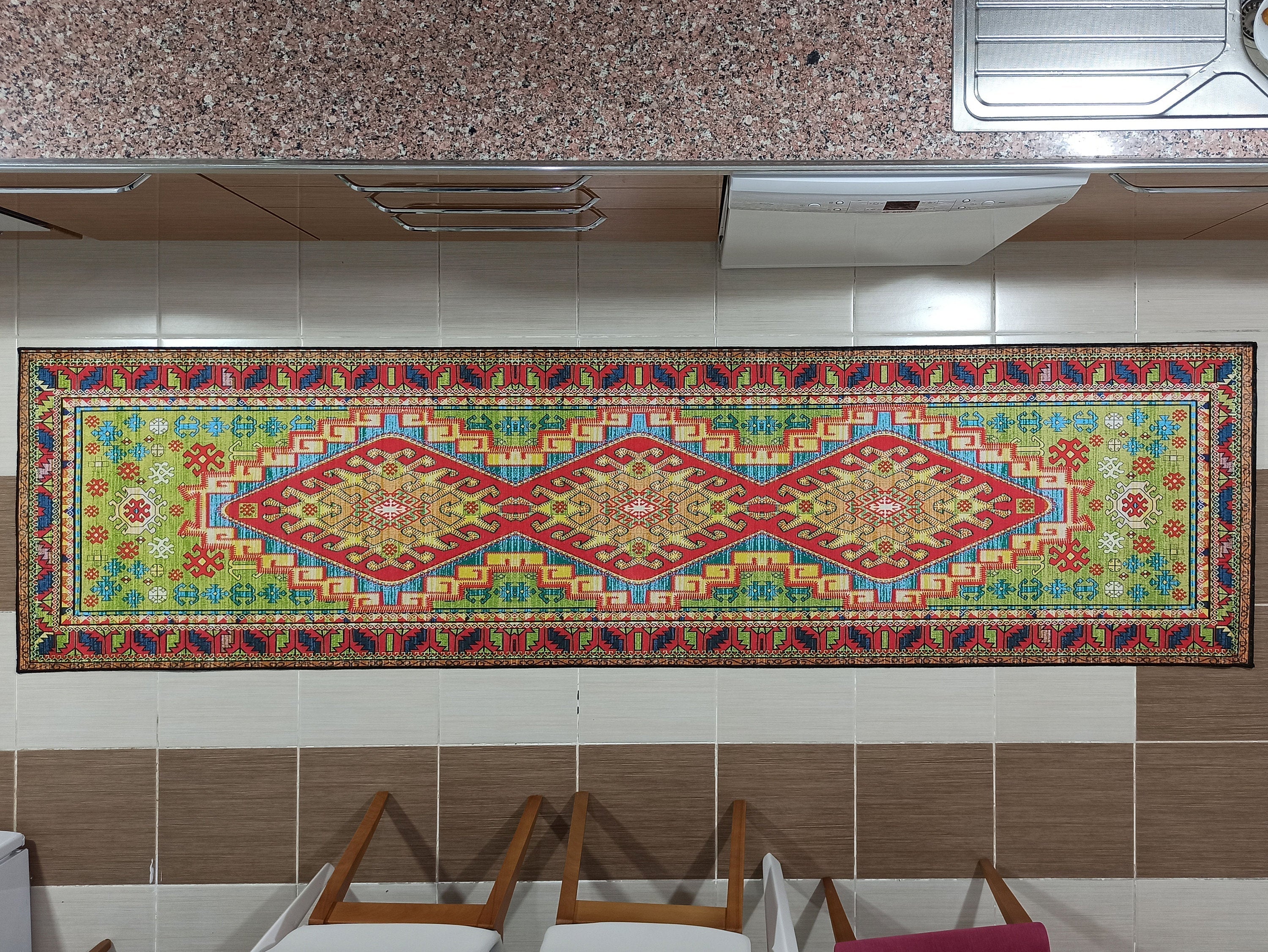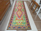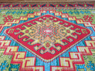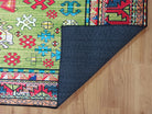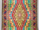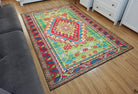 Nalan Rug offers green and red Heriz design, with a colorful Persian pattern, and Kilim textured rug to add oriental style and comfort underfoot. Perfect for all areas of the home. This is a lovely rug that can fit wonderfully in any room you want to make special.