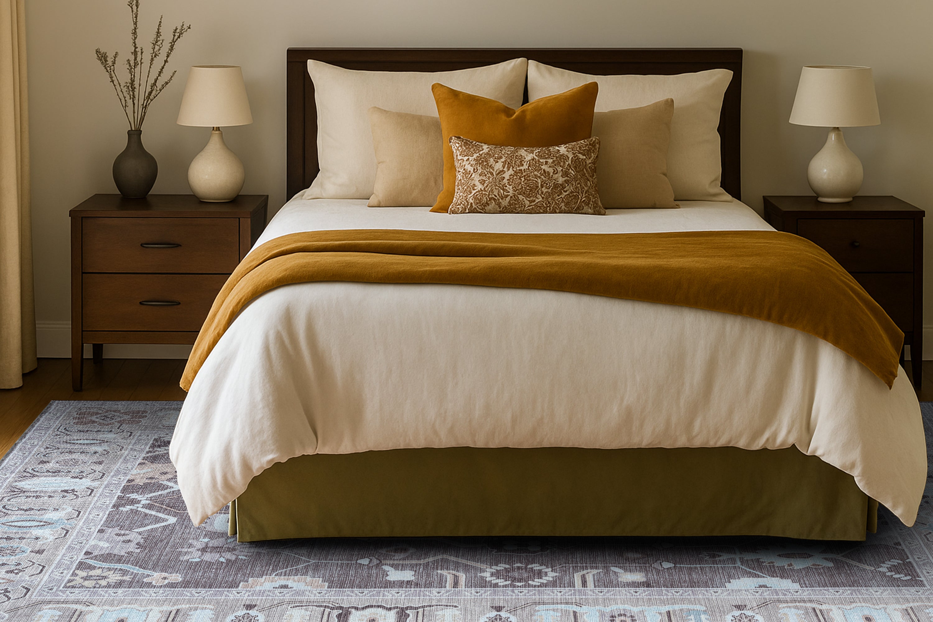 When choosing a bedroom rug, consider your bed size. A large rug under the bed creates a cozy focal point, while smaller rugs on the sides add comfort and style, complementing your decor and enhancing the room's ambiance. Need help picking the perfect size or placement? Check out our Bedroom Rug Guide for tailored tips. You can also explore our full Rug Guide for rug advice for every room.