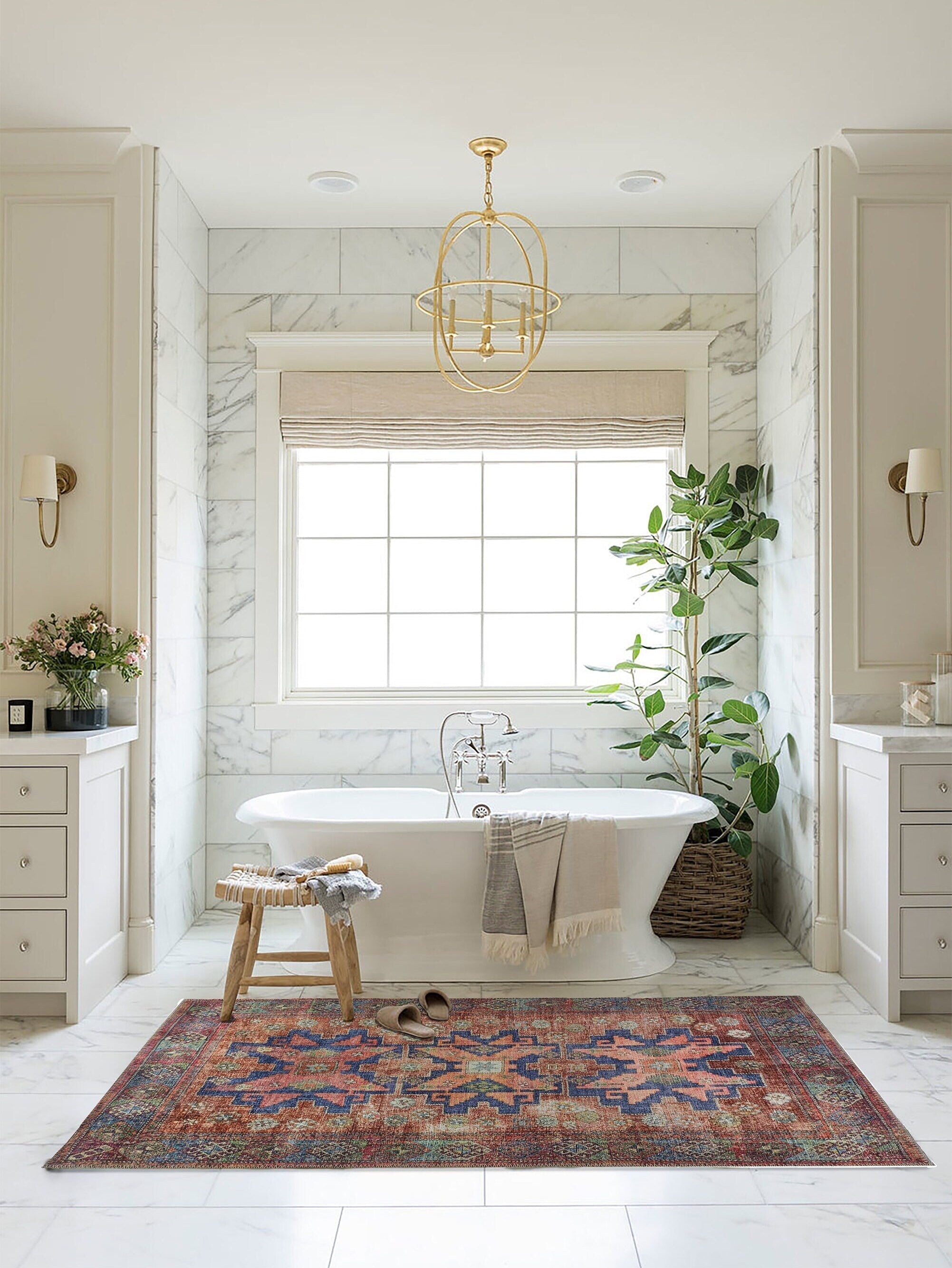 Available in a variety of sizes, this rug is well suited for living rooms, dining rooms, bedrooms, kitchens, home offices, entryways, bathrooms, and hallways.