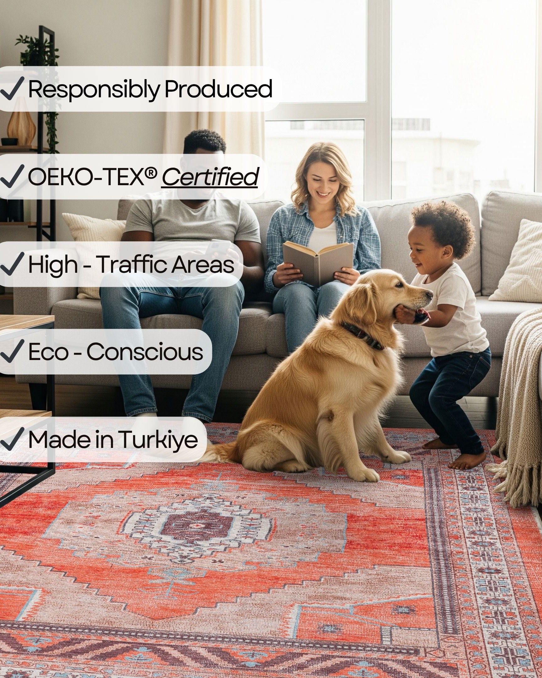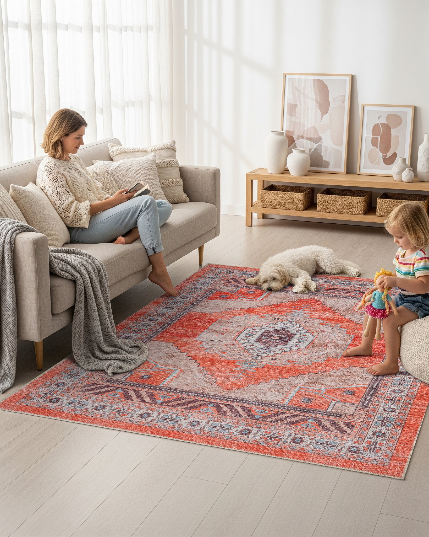 Explore our Washable Oushak Rug Collection — timeless Turkish-inspired designs made easy for everyday life. Soft, vintage patterns with machine washable ease. Perfect for families, pets, and stylish homes.