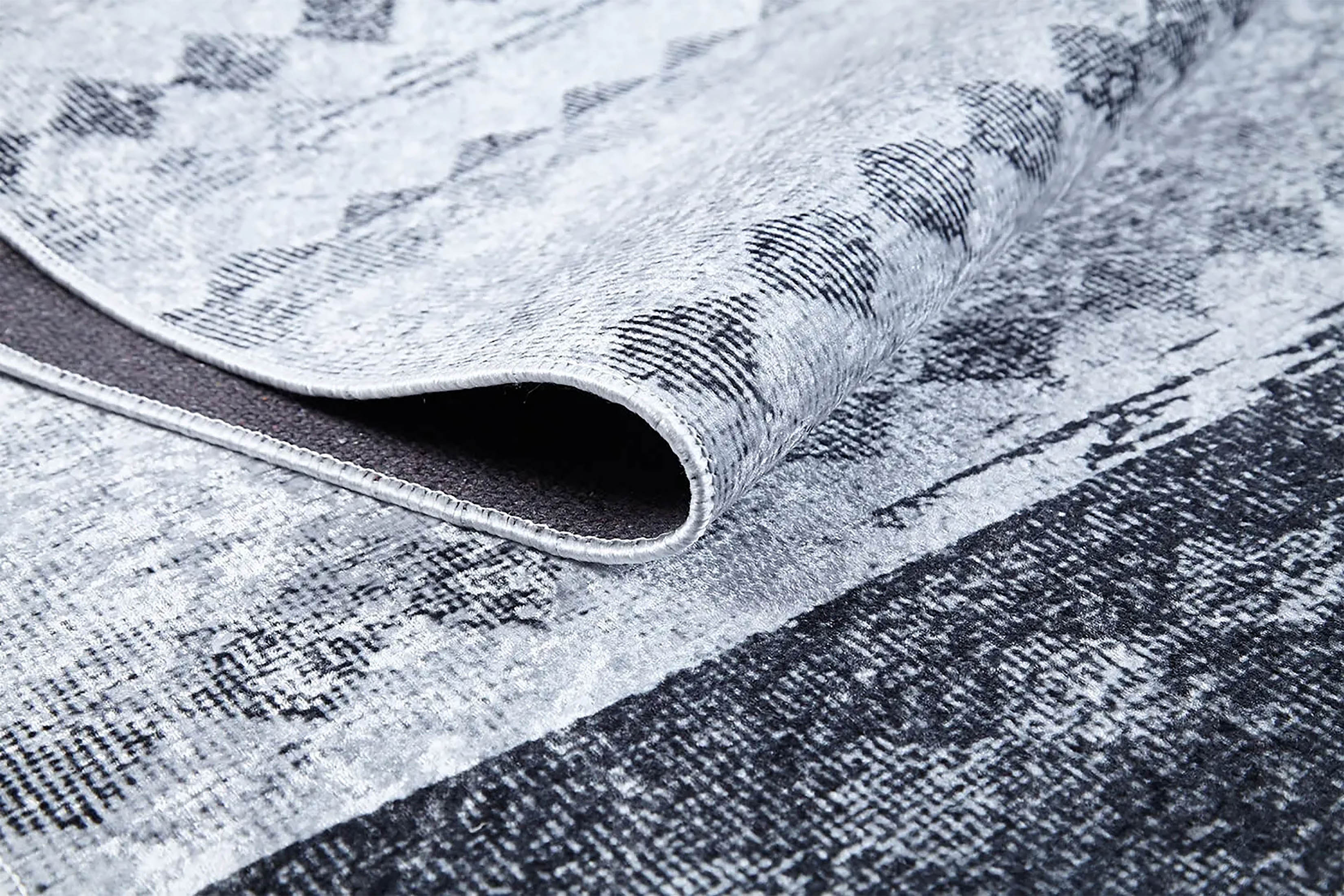 Dahlia geometric antique vintage mid century rug, introducing an oriental vibe and vintage style. The gray colors accentuate this antique style, while the faded design keeps it more calm and smooth. The handwoven effect with the inventive printing process perfectly provides a textured effect by portraying every individual knot on a soft base.Β