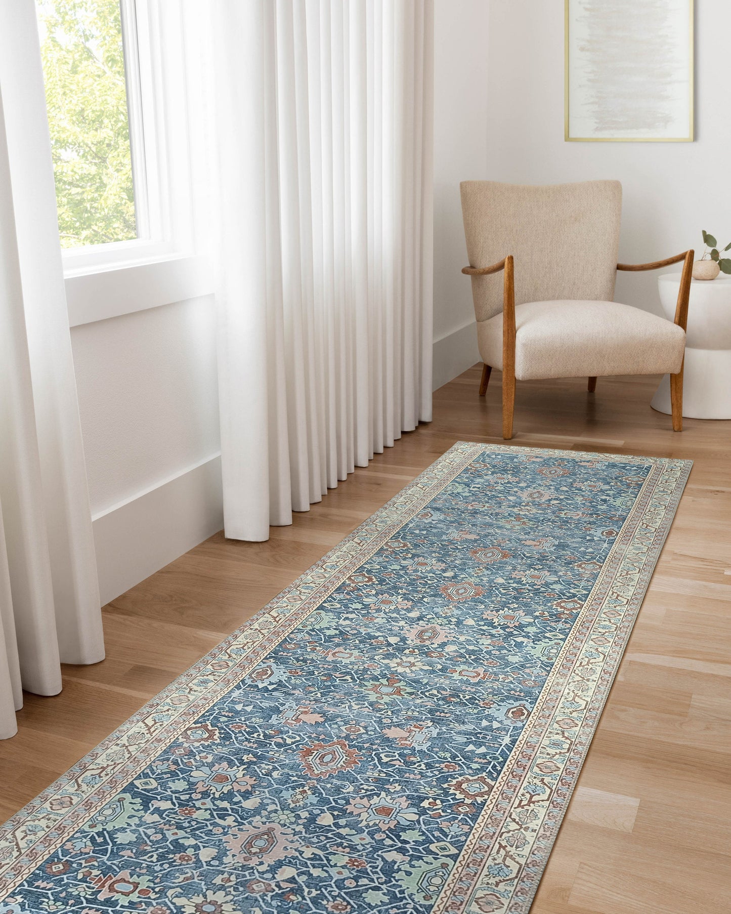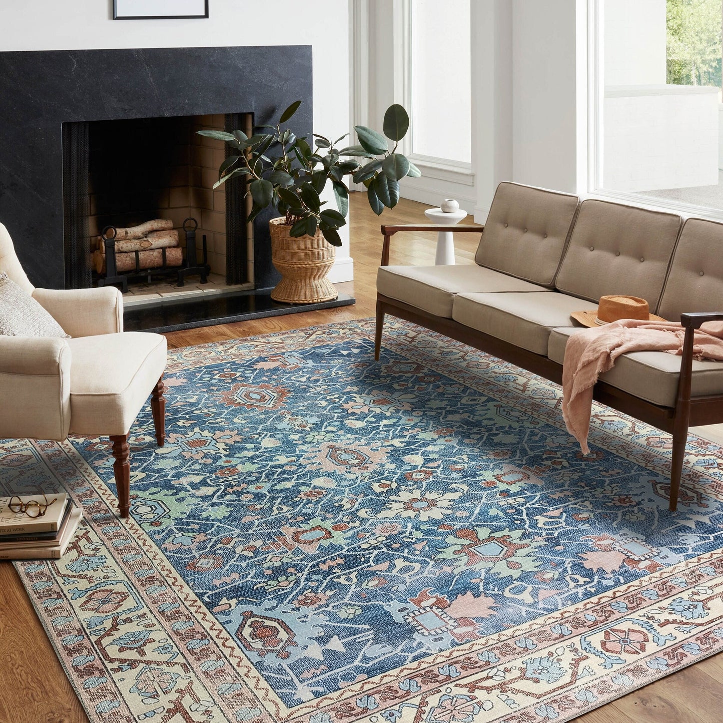 Step into timeless elegance with the Axelle Blue Turkish Oushak Vintage Rug, a beautiful blend of vintage charm and contemporary design Inspired by well-traveled vintage designs. Combines the charm of timeless designs with easy-care, livability for any home or lifestyle. Features a fresh incarnation of the vintage Turkish rug look. Classic in pattern and modern in color, this rug boasts a beautiful palette of blue, muted beige/ivory, light pale blsuh, muted pale green and brown, featuring dye-lot details. Made in Turkiye. This low pile digitally printed assortment of rugs features stunning designs and perfectly distressed effect for effortless charm that are matched with a traction backing ideal for heavily trafficked, hard surface spaces such as entryways, halls, living rooms, bathrooms, and kitchens. Oushak rugs originate from Ushak, Turkiye, and are recognizable by their distinct patterns and color palettes. Oushak rugs are highly sought after and timeless floor coverings. Want to see more Oushak Rugs?Itβs our purpose to create beautiful livesβfor the artisans who make our products, for our employees, and for our customers. Responsibly sourced materials are grown, collected, and manufactured according to fundamental environmental, social, and ethical accountability benchmarks. Your partnership supports this mission. οΈ Please Note: All sizes are nominal, accepted variance is +/- 4% Blot spills immediately with a clean, dry cloth. Vacuum regularly with beater bar off. If the rug gets wet, place it on a flat surface to air dry. We want you to be thrilled with your purchase. If you're not completely satisfied, weβll gladly offer you a refund of the merchandise price within 30 days of receipt of product. If you have questions about shipping, returns or delivery, please visit our shop page, or contact us.